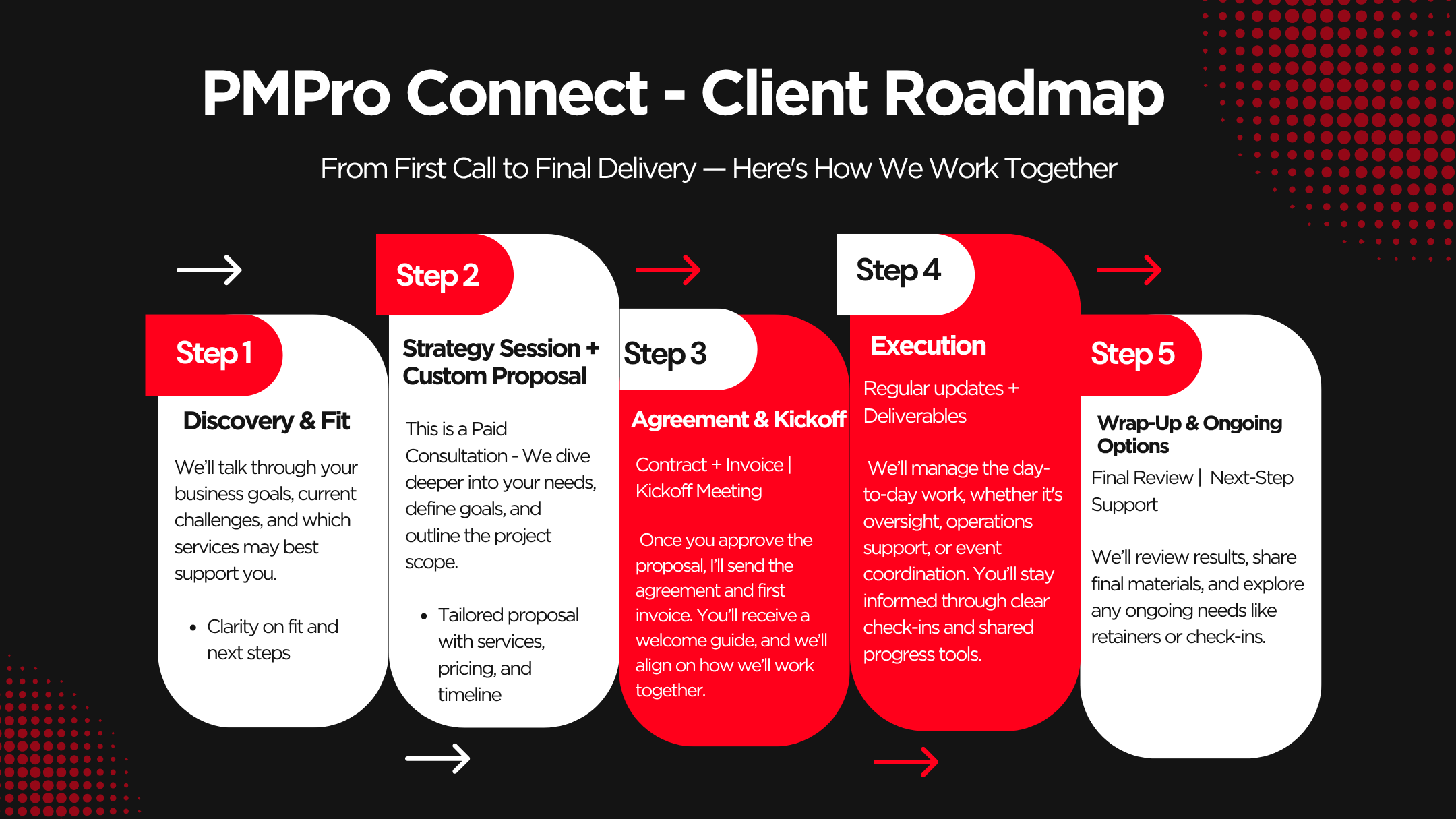 PMPro Connect offers customized consulting solutions that help non-profits, small businesses, entrepreneurs, and organizations operate more efficiently and achieve their goals. Our expertise spans project management and operational strategy, providing structured support and process optimization tailored to your needs. Whether you're launching a new project or refining your business operations, we deliver strategic guidance and hands-on support to bring your vision to life. Partner with us to streamline your workflow and drive impactful results with confidence.